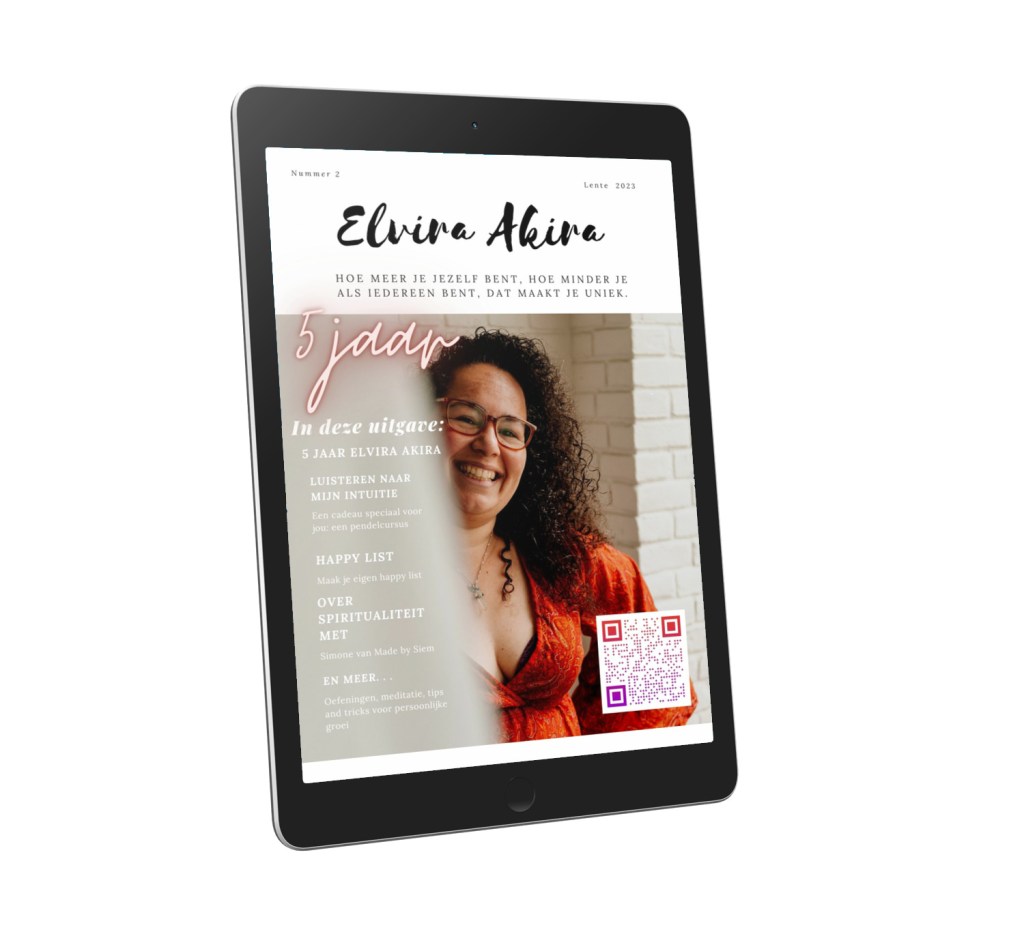 Praktijk Elvira Akira 5 jaar! Mijn tweede e-magazine editie lente is vanaf heden beschikbaar, dus pak je kopje koffie of thee erbij en laat je verrassen. Dit is een dikke vette waardevolle feest editie en geheel gratis te bekijken. Voor mijn vijfjarig bestaan deel ik graag extra cadeautjes uit en ik heb er lang over zitten nadenken. Het magazine is al een cadeau om te ontvangen, maar ik heb speciaal voor jou om je intuïtie te trainen een pendel cursus toegevoegd. Een fijne en vrij simpele manier om te ontdekken hoe je naar de fluisteringen van je hart kunt luisteren. Ik hoop dat je net als ik kan genieten van dit magazine. Haal eruit voor jou wat bij je past en laat gaan wat niet bij je past. Deel het magazine via jouw social media kanalen en ook met je vrienden, familieleden, collega’s. Je helpt mij er enorm mee.