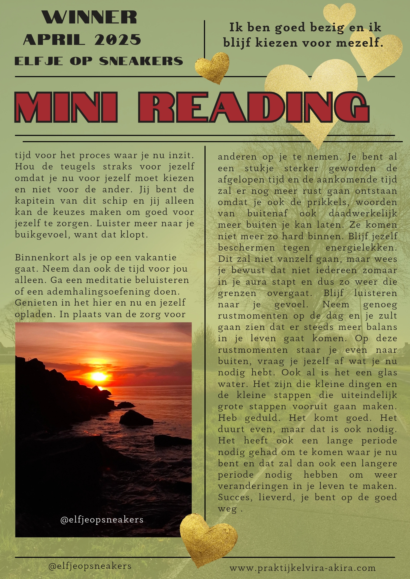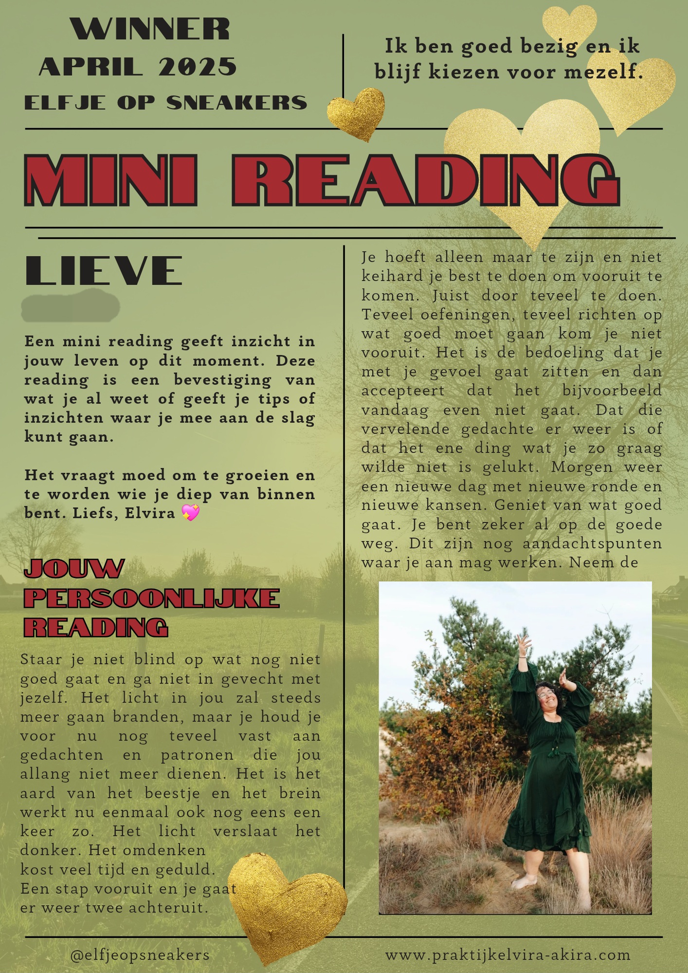 Eind mei won ik een mini- reading van @elfjeopsneakers. De review heeft even op zich laten wachten… en precies om de reden die zo mooi werd benoemd in de reading zelf. Zoveel ballen in de lucht moeten houden – in het positieve én het uitdagende dat ik vergat stil te staan. Het is hoog tijd om weer terugte keren naar mezelf en mezelf vaker de vraag te stellen: “Wat heb ík nodig?” Tijd om mezelf te herpakken. Focus! De woorden uit de reading waren zo raak. Een liefdevolle deken, en tegelijk een krachtig zetje in de rug. OL We gaan ervoor! Lieve elfjeopsneakers, heel veel dank voor deze mini- reading. Zo raak, zo kloppend, en precies waar ik nu middenin zit.