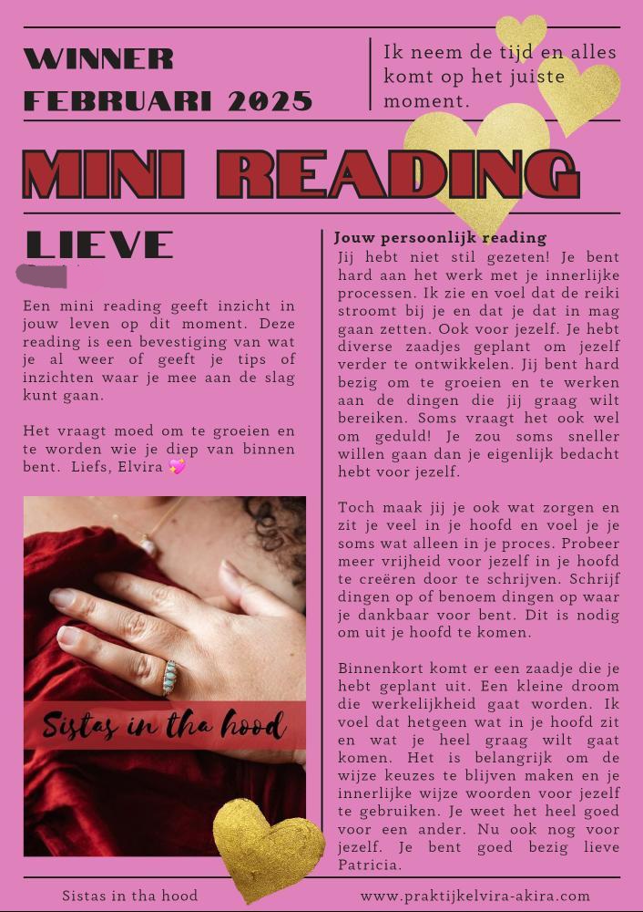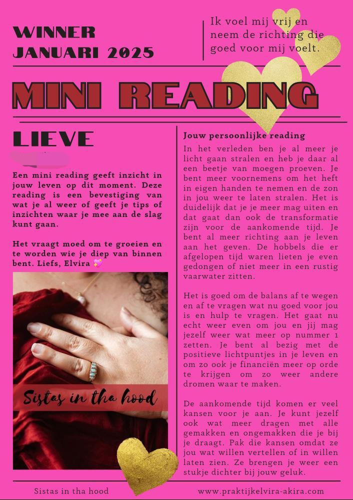Lieve Elvira, Dank je wel voor deze bijzondere mini reading. Je woorden raakten me echt. Het voelde alsof je precies wist waar ik nu sta in mijn leven. De boodschap om meer naar mijn intuïtie te luisteren en mezelf niet te vergeten kwam precies op het juiste moment.Heel waardevol om te ontvangen.