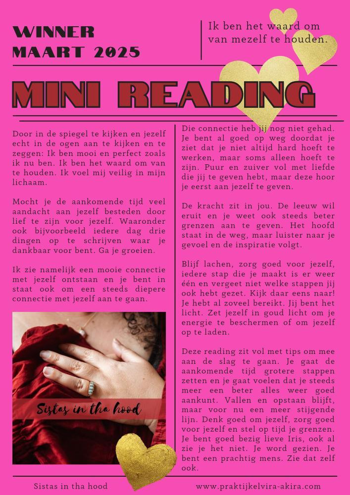 en daar ben ik echt trots op. Dankjewel voor deze reading,ik zal het opschrijven en meer vorm gaan geven aan mijn verlangens.