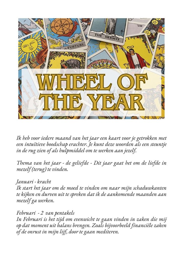 Een jaarwiellegging met 12 kaarten, eentje voor iedere maand en meer… Een super waardevol boek over jou met inzichten en tips voor het aankomende jaar.