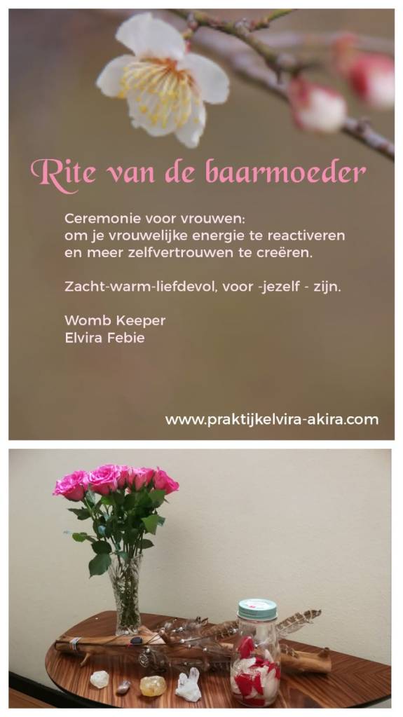De rite van de baarmoeder is zeer krachtig en brengt, in alle zachtheid, jouw moederschoot van creatie in natuurlijke balans waardoor je gevoel van zelfvertrouwen en eigenwaarde weer zal stromen. Een heling, een zegening en een wedergeboorte van de sterke, liefdevolle essentie van jouw vrouw-zijn.