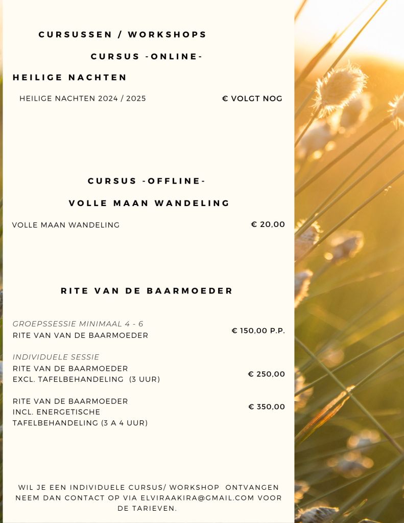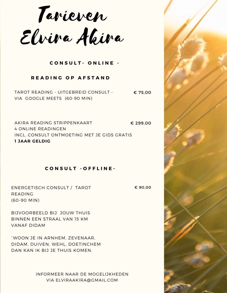 Gemaakte afspraken, mondeling, telefonisch, per mail of online die niet minimaal 24 uur van te voren zijn afgezegd worden in rekening gebracht. De consulten in de praktijk van Elvira Akira kunnen contant betaalt worden na de behandeling en online consulten (afspraken via e-mail/google Meets) dienen vooraf per bankoverschrijving of betaalverzoek betaalt te worden.
