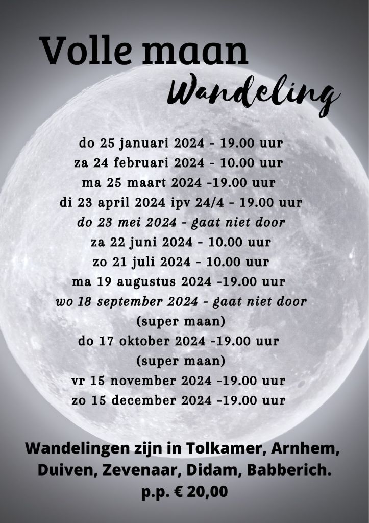 Exacte locatie ontvang je na aanmelden en betaling. Op dit moment is de investering voor een volle maan wandeling € 20,00 p.p. of klik hier voor de meest recente tarieven. PS: bij de avondwandelingen in het donker denk dan aan een hesje of i.c.m. lampjes zodat je zichtbaar bent voor verkeer.